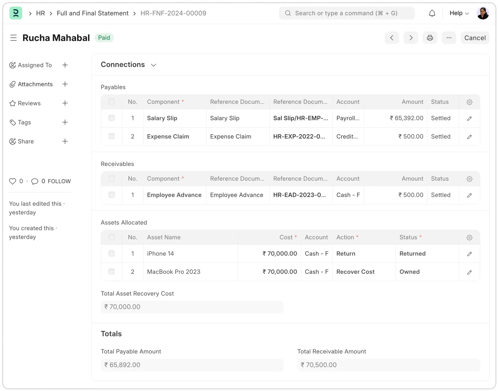 Tagrit HR automates full & final settlements, handling dues, assets, and accounting adjustments while offering flexible asset recovery options for departing employees.