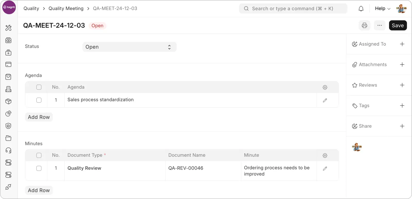 Quality meetings are held to review the quality assessments generated. TAGRIR ERP’s feature for quality meetings allows you to set the agenda, track attendees, capture minutes, and outline actionable items. It provides a clear record of discussions on quality reviews, including areas of concern, decisions made, and necessary actions for improvement. This ensures accountability and helps track follow-up tasks effectively.